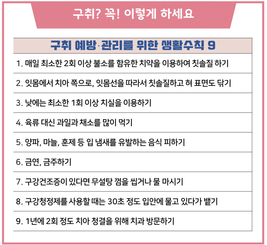 특히 틀니나 기타 보철물을 사용하는 사람은 다른 사람보다 입 냄새가 쉽게 날 수 있으니 구강 위생에 더욱 관심을 쏟아야 합니다.