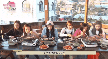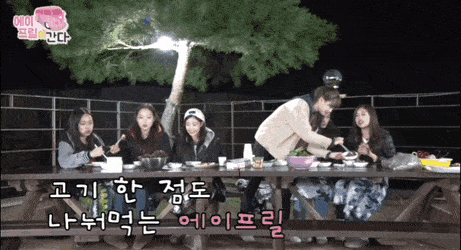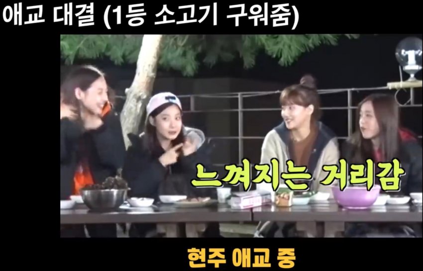현주(가운데모자)빼고 고기 먹여주는 이나은