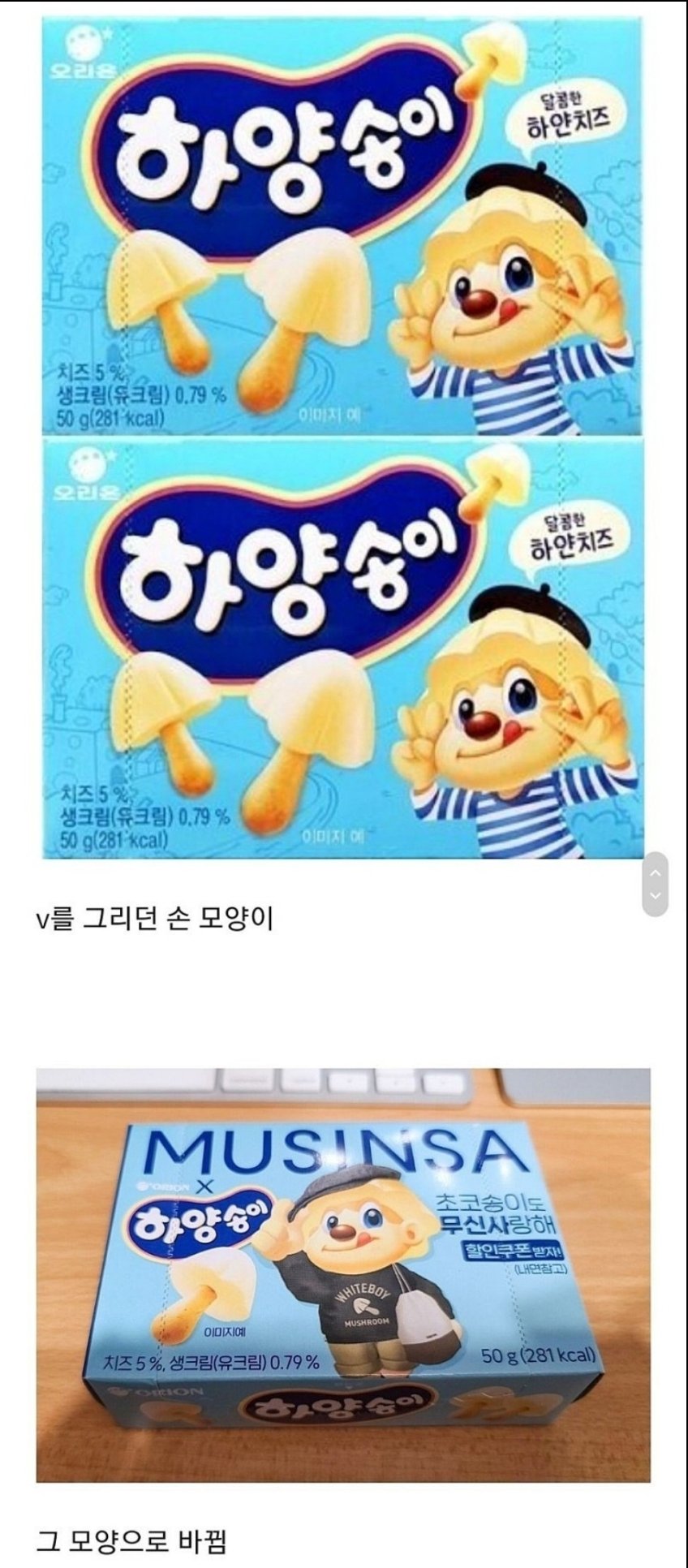 오리온 하양송이랑 무신사가 콜라보해서 과자나왔는데