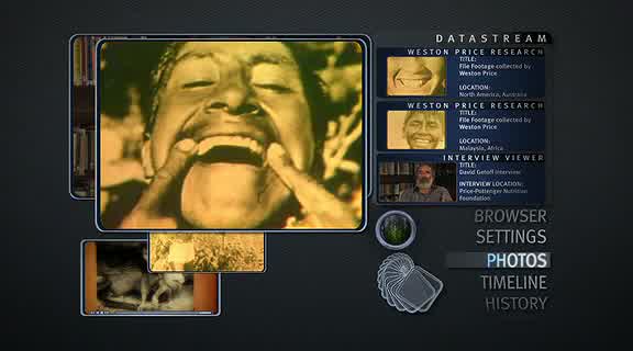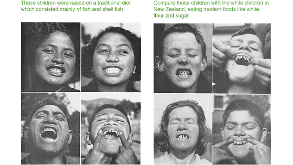 왼쪽은 원시 식단에 따른 사람들의 치아, 오른쪽은 서구 식생활(설탕, 밀가루) 이 들어온 뒤의 사람들 치아이다.